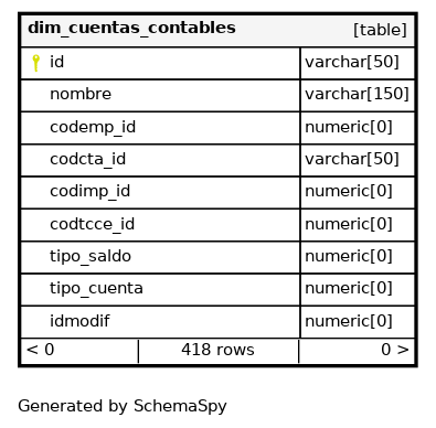 | dim_cuentas_contables_pkey | Primary key | Asc | id |